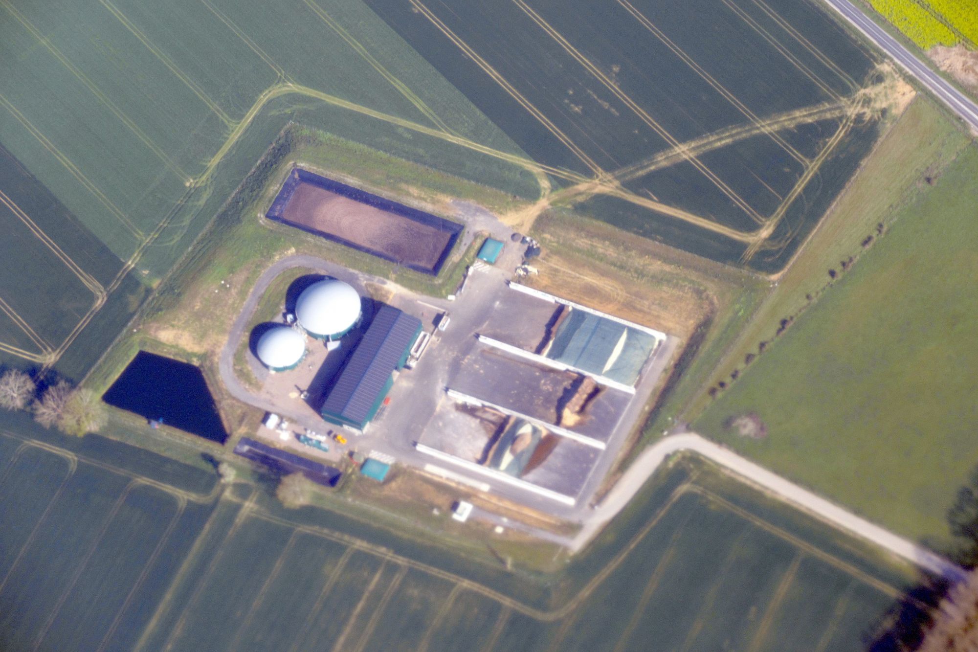 : La méthanisation des matières a lieu dans un digesteur (dôme à gauche), le biogaz produit est épuré dans le cabanon d’épuration (à droite)